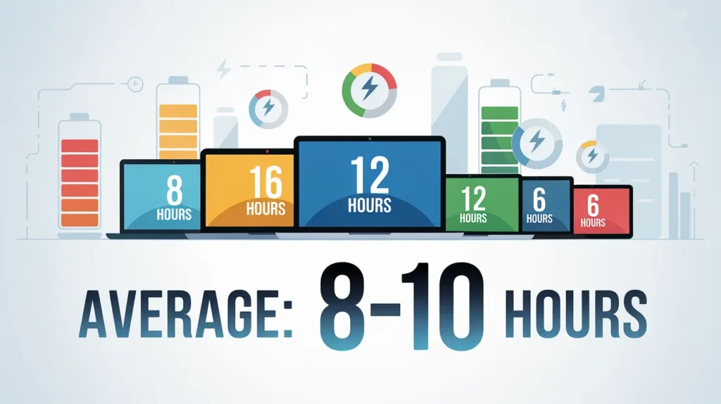Ultrabooks and lightweight laptops usually last 8–12 hours, mid-range laptops 6–9 hours, while gaming laptops often deliver 2–5 hours due to high power consumption.
